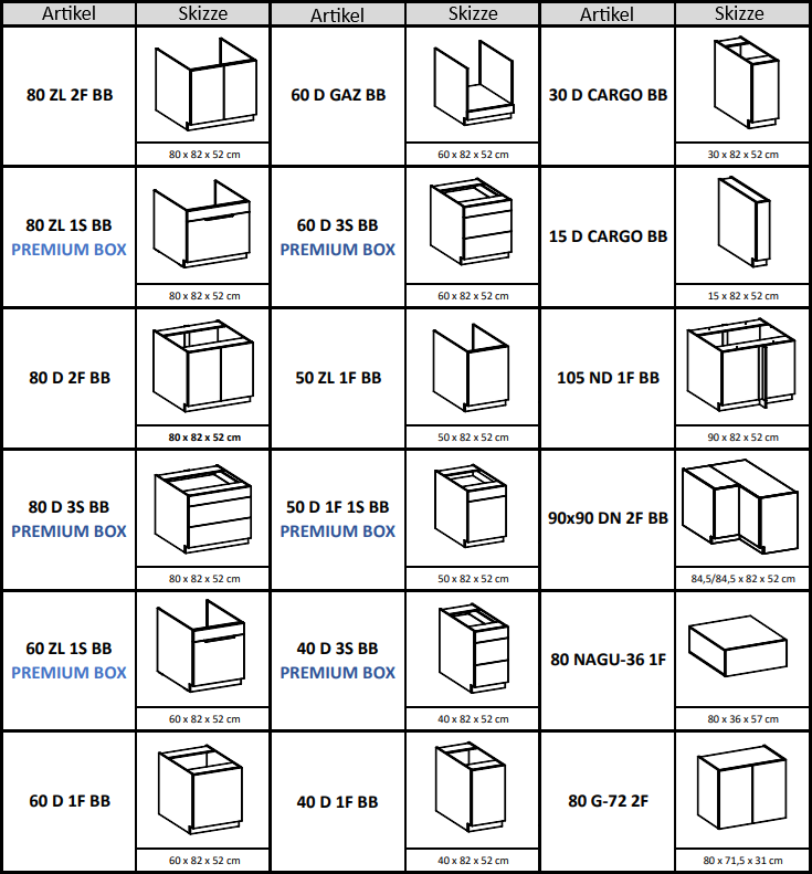 ✔ die Unterschränke verfügen über keine Arbeitsplatte,