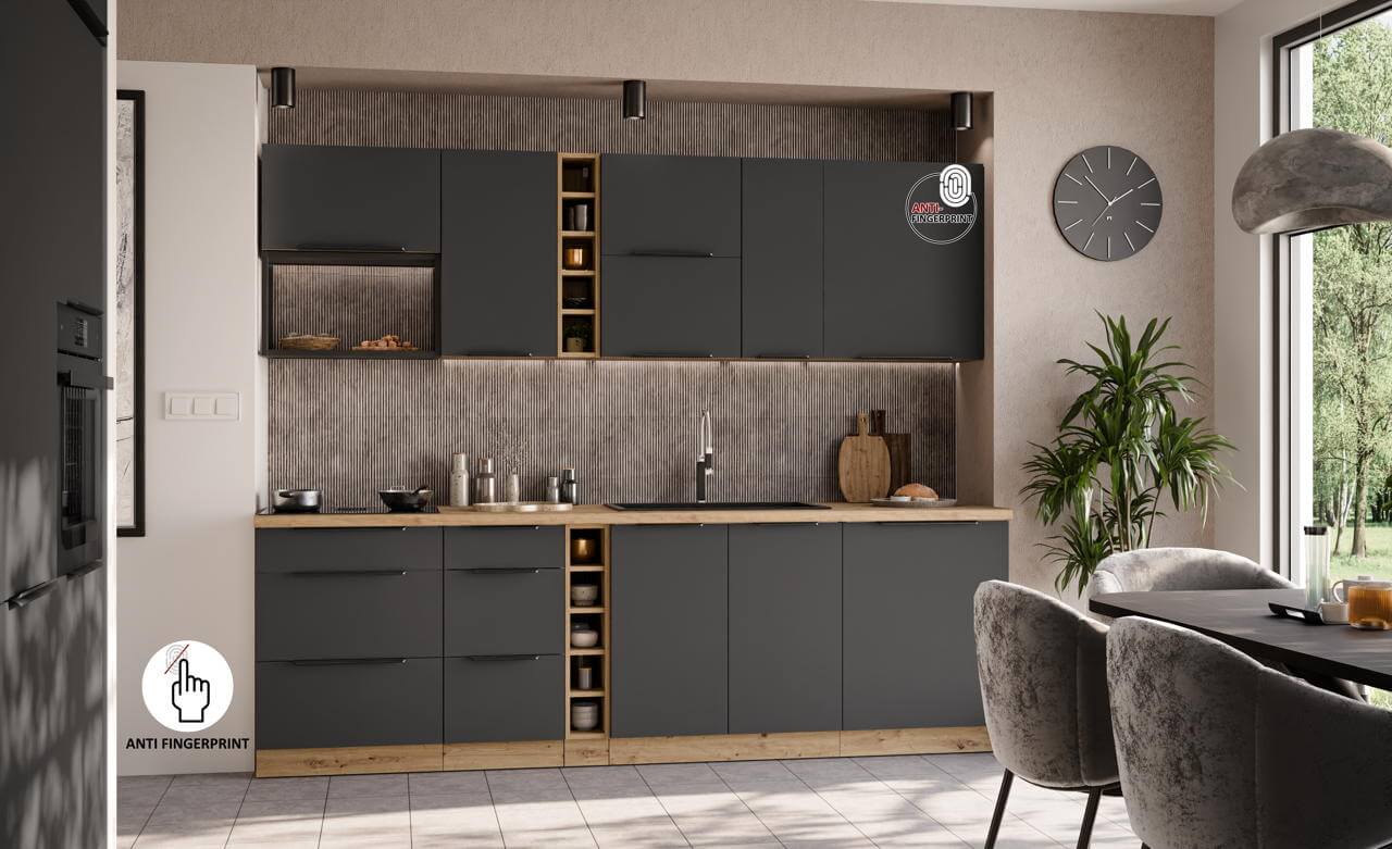 Küchenmöbel-Set Aria graphit/artisan 255 cm, bestehend aus 13 Küchenschränken mit Arbeitsplatte.
