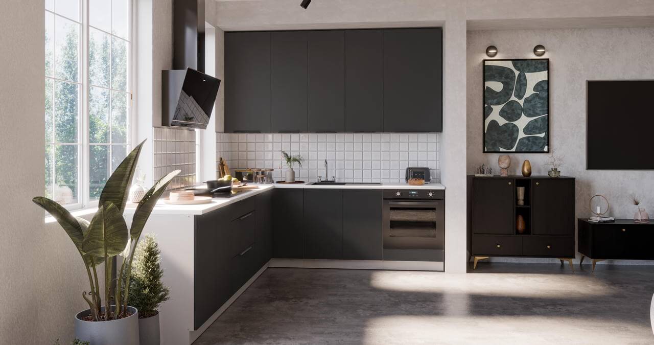Küchenmöbel-Set Aria schwarz/weiß 290x230 cm, bestehend aus 10 Küchenschränken mit Arbeitsplatte.