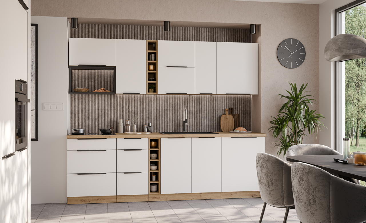 Küchenmöbel-Set Aria weiß/artisan 255 cm, bestehend aus 13 Küchenschränken ohne Arbeitsplatte.