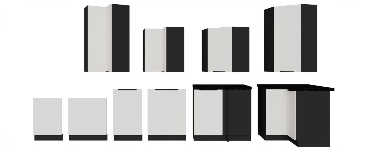 Küchenmöbel-Set Aria weiß/schwarz 390 cm, bestehend aus 15 Küchenschränken ohne Arbeitsplatte.