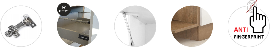 ✔ Scharniere von führenden Systemherstellern, u. a. GTV und REJS, mit serienmäßigem Soft-Close-System (gilt nicht für Eckschränke),